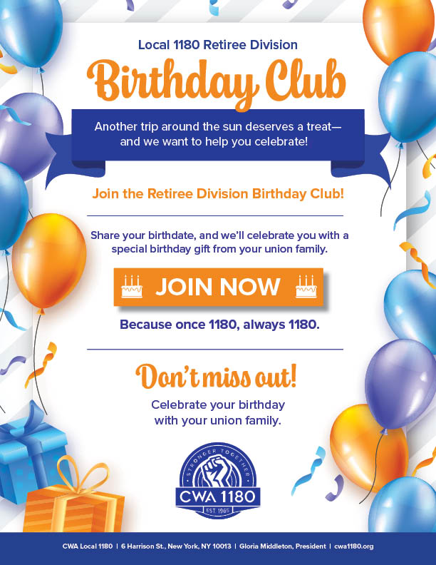 Join the Local 1180 Retiree Division Birthday Club
